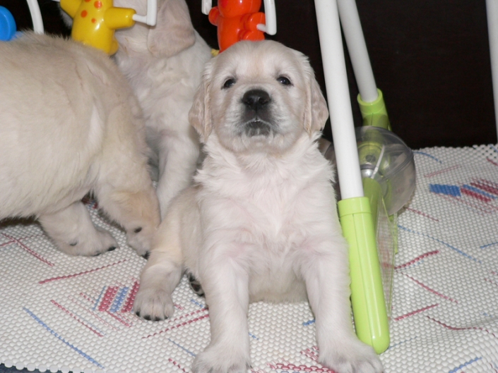 Typische Golden Welpen, sehr freundliche zutrauliche Welpen die sich zum Zeitpunkt der Wurfabnahme sehr ruhig und ausgeglichen zeigten. Sehr schöne Fellanlage und Gebäudeanlagen und sehr gute Knochenstärke.Sehr liebevolle, optimale Welpenaufzucht durch die Züchterin die ihre Welpen super sozialisiert hat!
