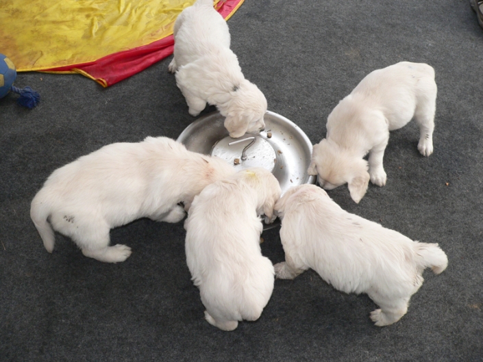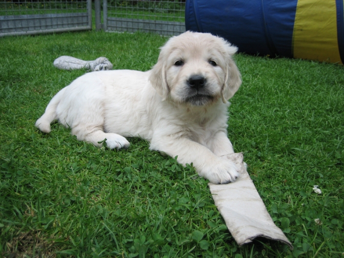 Freundliche, zutrauliche, sehr menschbezogene Goldenwelpen. Sehr schöne Köpfe, super Knochenstärke und Gebäudeanlagen. Sehr schönes Pigment. Super Fellanlage, sehr schöne Scherengebisse.